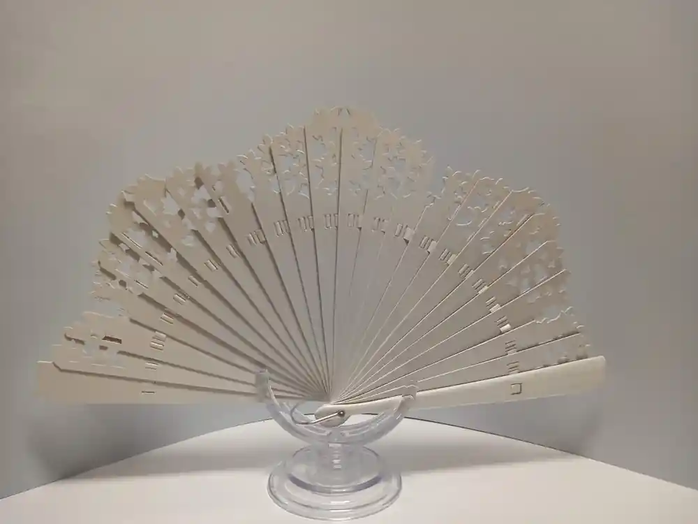 Abanico de madera de 23 centímetros cerrado. Barnizado 2 caras (mate por detras brillo por delante).Color blanco.Fabricado en España.
