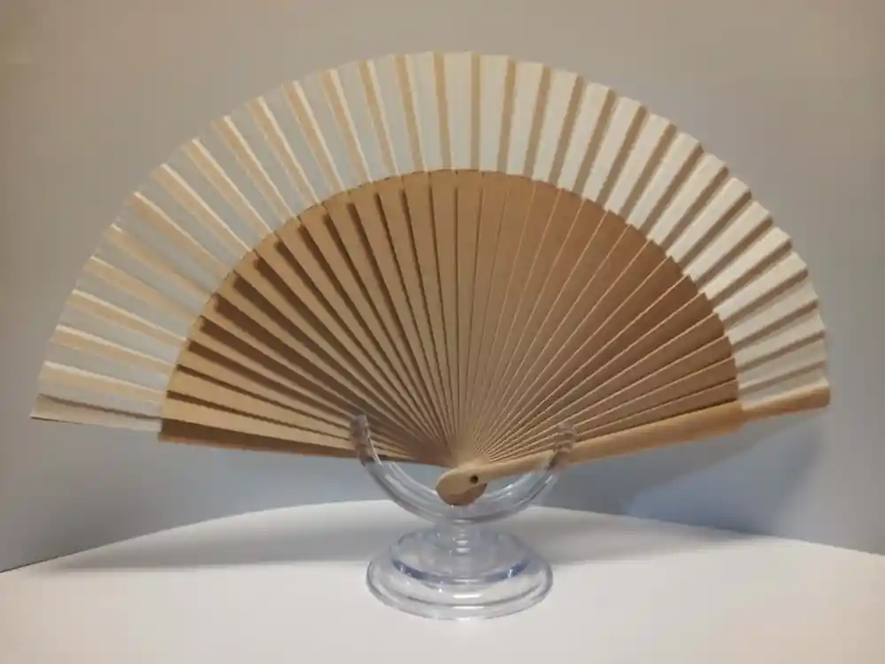 Abanico de madera básica y ligera, sin barnizar.Longitud total: 23 centímetros (17 cms. madera, 6 cms. tela)