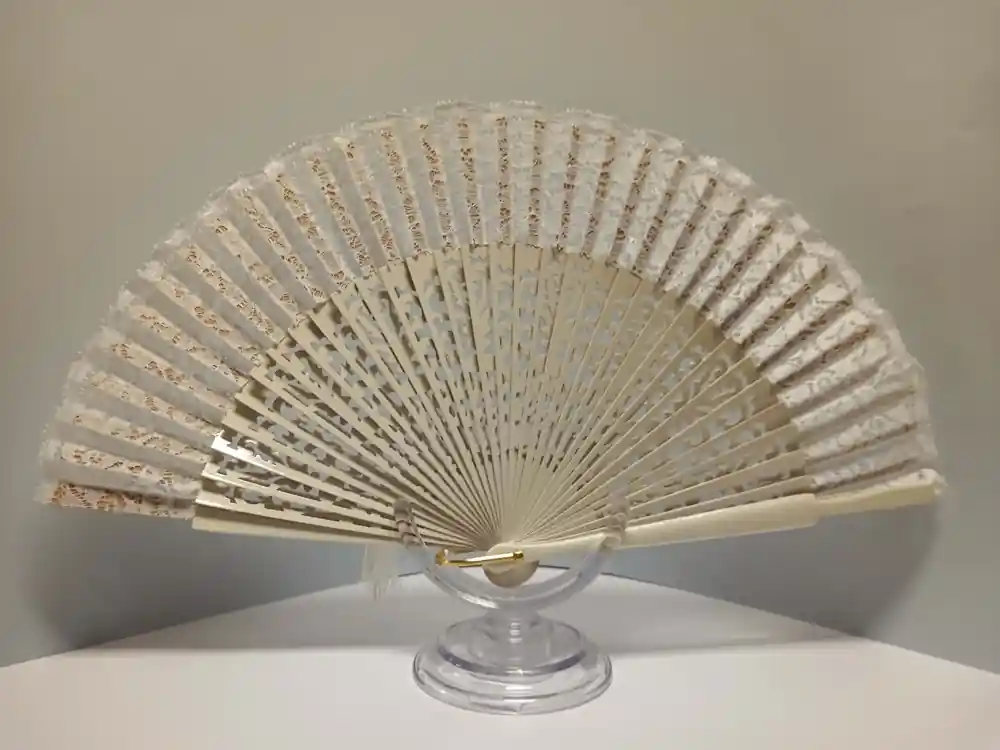 Abanico de madera barnizada en tono marfil, tela de algodón y encaje en color blanco.Longitud total: 23 centímetros.Fabricado en España.