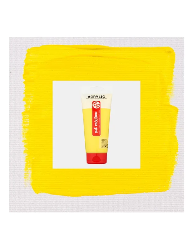 ArtCreation Essentials ofrece un acrílico estudio de calidad fiable a base del 100% de resina de acrilato. La pintura es pastosa, cuando está seca tiene un brillo sedoso y se puede sobrepintar casi de inmediato. La pintura acrílica Talens ArtCreation Essentials puede usarse directamente o diluido con agua, y una vez seco, es resistente al agua. Por su buena adherencia, con esta pintura se puede trabajar sobre cualquier sustrato que sea algo absorbente y esté libre de grasa y polvo, como el lienzo y el papel, pero también el yeso, el tablero, la madera, la piedra o el cementoACRILICO ART CREATION 200ML 275 AMARILLO PRIMARIO
