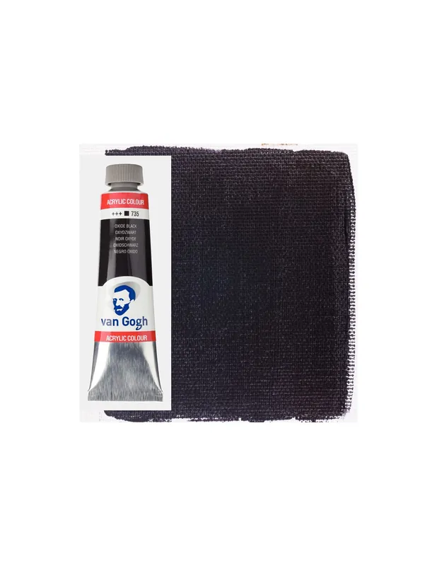 Acrilico Van Gogh de alta calidad, con colores intensos y vivos que se mezcla y trabaja con gran facilidad. Alto grado de pigmentación. La resistencia a la luz que es de buena a excelente, hace que los trabajos conserven su estado original por largo tiempo.ACRILICO VAN GOGH 40ML 735 NEGRO OXIDO