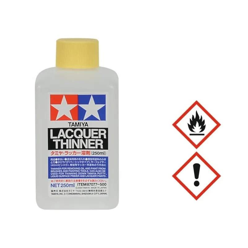 Disovente Tamiya Lacquer Thinner de tipo universal en envase de 250 ml. Apto para pinturas esmalte o acrílicas. Para limpieza de superficies y disolución de masillas monocomponente putty.Para diluir las pinturas acrílicas Tamiya y Gunze Sangyo. La proporción adecuada varía según el resultado deseado, pero lo normal es partir de un 50-50% si la aplicamos con aerógrafo.El Lacquer Thinner deja la pintura en condiciones óptimas para ser aplicada con el aerógrafo y facilita un pulverizado muy fino.Ventilar bien la habitación.