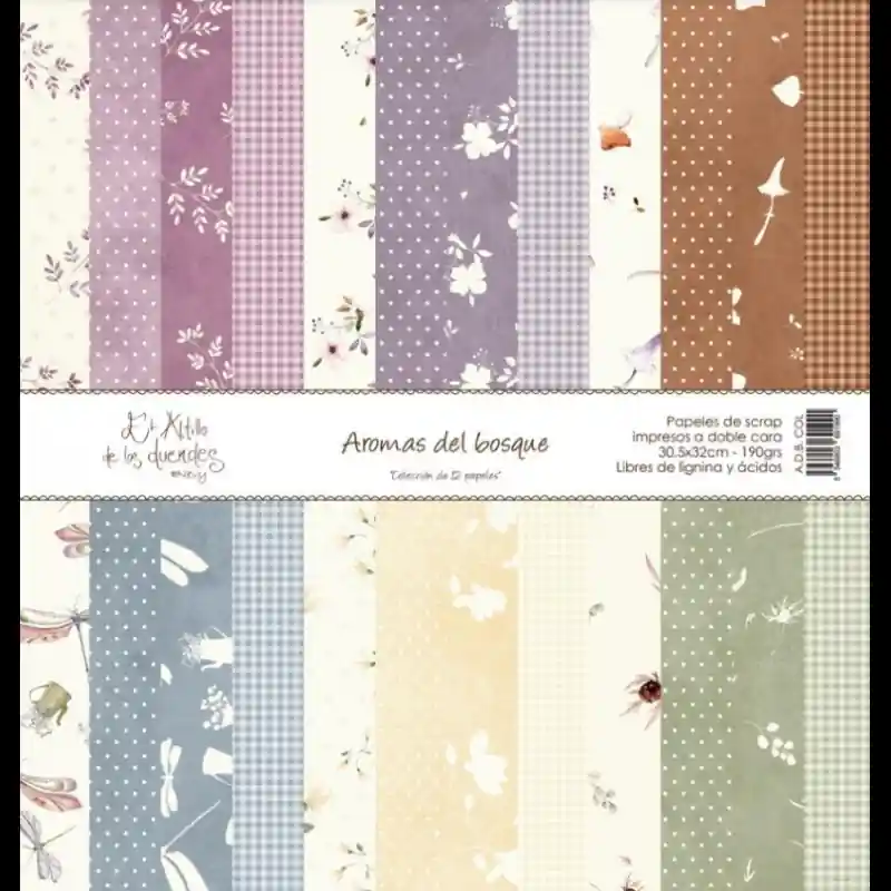 Kit AROMAS DEL BOSQUE de EL ALTILLO DE LOS DUENDESColección de 12 papeles más la portada de 30.5×30.5 cm, 190 gr. sin ácidos ni ligninas.