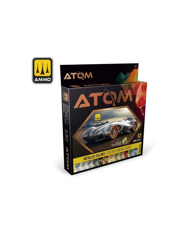Set de 12 colores ATOM con base al agua, de alta calidad y especialmente seleccionados para proporcionar la gama de colores metálicos más comúnmente utilizados en los proyectos de pintura de tus modelos. Con este set podrás pintar de forma cómoda los detalles metálicos de tus maquetas, así como miniaturas históricas y de fantasía. Este set facilita la tarea de elegir los colores para nuestros modelos, ahorrando un tiempo valioso. Los tonos son exactos, aunque ligeramente aclarados para compensar el efecto de escala en cualquier maqueta. Esta pintura presenta una fórmula con base al agua pero que se comporta con todas las ventajas de una laca y está optimizada para obtener el máximo rendimiento tanto a pincel como con aerógrafo. Entre sus características únicas, destacan su capacidad de autonivelación, secado rápido y su poder de cubrición, haciéndola única en el mercado. Además, es extremadamente resistente, permitiendo usar sobre ella acrílicos, esmaltes o productos más agresivos, como los líquidos para calcas. Se presenta en un nuevo envase transparente de 20 ml de capacidad con un nuevo tapón que puede abrirse y cerrarse con una sola mano. Esta pintura no es tóxica ni tiene olor. Colores incluidos en este set:ATOM-20164 SILVERATOM-20165 ALUMINUMATOM-20166 STEELATOM-20167 GUN METALATOM-20169 BURNT IRONATOM-20170 COPPERATOM-20171 GOLD PINKATOM-20172 GOLDATOM-20173 BRASSATOM-20174 METALLIC REDATOM-20175 AOTAKE GREENATOM-20176 AOTAKE BLUE
