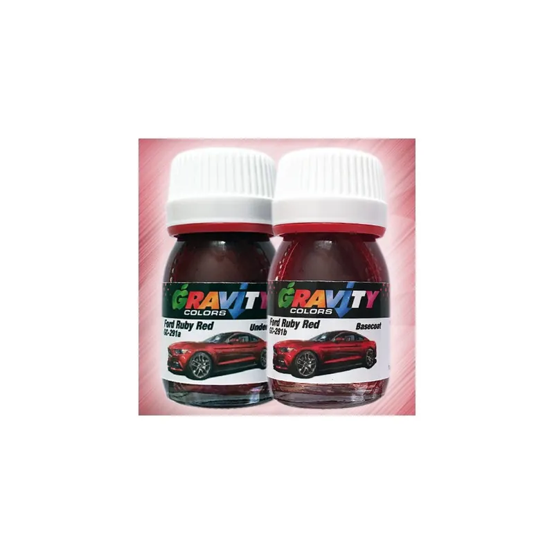 Ford Ruby Red Gravity Colors Paint – GC-291 Tri coat paint that contains a pearl red undercoat and a candy red basecoat, used by Ford since 2011. Color matched airbrush ready lacquer paint. Net volume: 2 bottles of 1 fl.oz/30ml (undercoat and base coat)