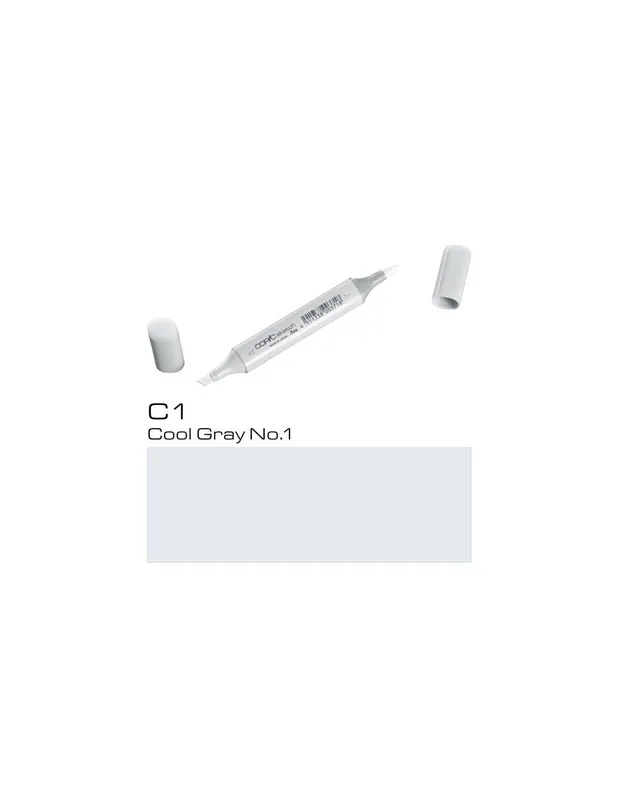 ROTULADOR COPIC SKETCH C 1 Cool Gray No.1COPIC SKETCH C 1 Cool Gray No.1Los rotuladores copic sketch son los rotuladores preferidos de los profesionales del diseño, la ilustración, el dibujo manga y el scrap.Con sus 358 colores tienes todo un mundo de posibilidades a tu alcance, es la mayor gama de colores que existe en rotuladores, dificilmente no encontrarás aquella tonalidad que estás buscando.El rotulador copic sketch tiene dos puntas: una biselada para colorear grandes áreas y otra de pincel muy flexible ideal para dibujar. Las puntas se pueden cambiar cuando se gastan.Son rotuladores recargables, se puede volver a aprovechar la carcasa, con un frasco de tinta copic ink de 25 cc puedes rellenar hasta 12 veces un sketch.La tinta copic es a base de alcohol, es permanente y no es tóxica. Cuando se seca está libre de ácido.Los rotuladores copic sketch se pueden utilizar también con el sistema de aerografia copic.