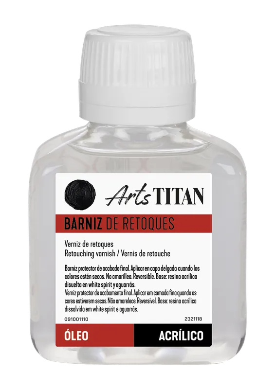 Barniz fluido titán (bajo contenido en sólidos). Sólido a la luz. No se cuartea.Duradero se usa para retocar cuadros pintados al óleo o acrílicos.Aplicar directamente encima de determinadas partes del cuadro, en capa delgada, para corregir rechupados o matizados, una vez el color esté seco.Puede utilizarse como barniz de cuadros en el acabado, si los colores están totalmente secos.Características:Uso en: Para retocar cuadrosAplicación: Pincel o paletinaNaturaleza: Resina acrílicaAcabado: BrillanteSecado: 60 – 90 min. a 23º CDiluyentes: Esencia de Trementina o de Petróleo (White Spirit)