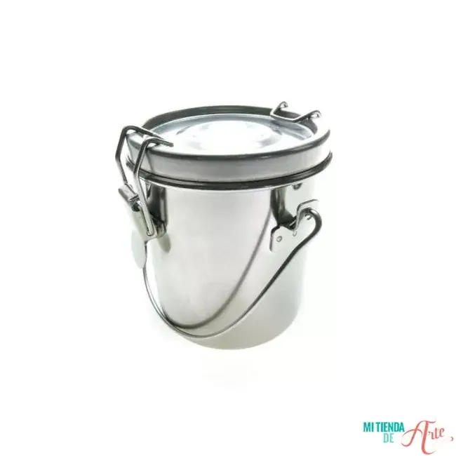 Limpia pinceles metálico de acero inoxidable de dos piezas con tapa7 cm de diámetro y 8,5 cm de altura.Contiene un asa metálica para transportar