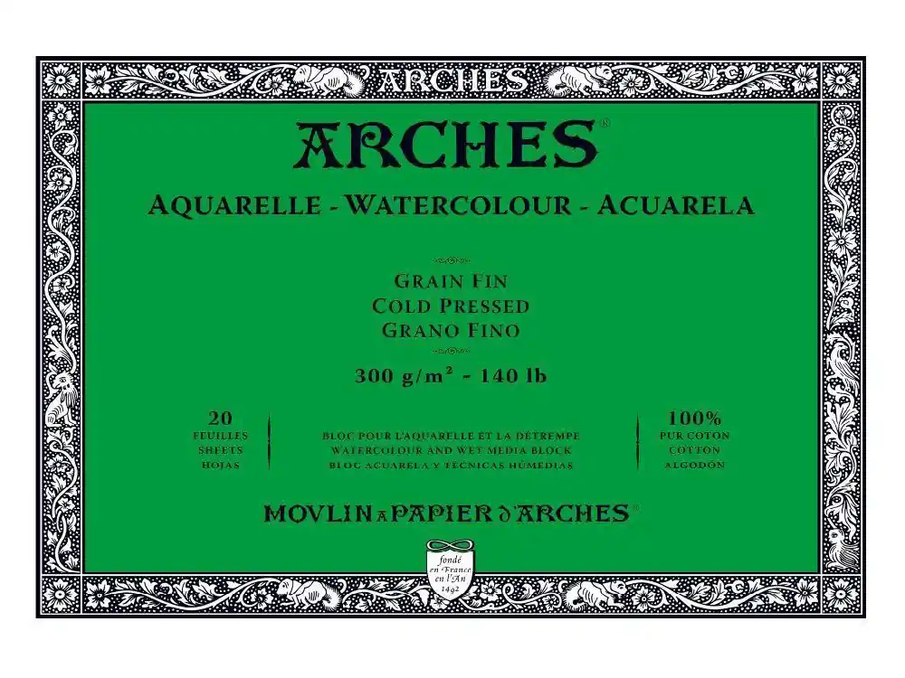 BLOC ARCHES ACUARELA ENCOLADO 4 LADOSAcuarela Arches es un papel que se fabrica en máquina redonda, es gelatinado y se seca al aire. Su composición, 100% algodón, le asegura resistencia y una gran estabilidad.De un blanco natural, este papel envejece sin amarillear y sin alterar el color de los pigmentos.Estos blocs Arches de papel de acuarela poseen, además de todas las características del papel Arches, la cualidad añadida de estar encolados a los 4 lados, lo que mantiene el papel tenso y facilita su uso.Aplicación: Idóneo para todas las técnicas húmedas, tales como: acuarela, aguada, tinta y acrílico.