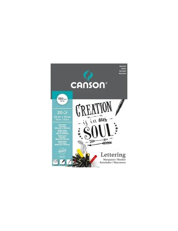 Bloc encolado Canson Lettering Market, 20 Hojas de 24x32cm (A4)Blanco puro, muy liso y de un grosor de 180gr ideal para marcadores, boligrafos y todo tipo de tintas.Papel ideal para lettering