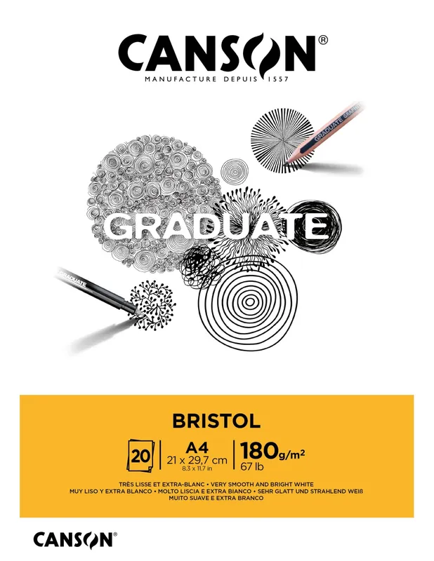 Bloc de Dibujo Canson A4 Bristol Graduate 2H, con 2 hojas de papel de alta calidad, está diseñado para técnicas de dibujo que requieren una superficie extremadamente suave y resistente. Con un gramaje de 250 g/m², su textura satén proporciona una base ideal para lápiz, tinta y rotulador.