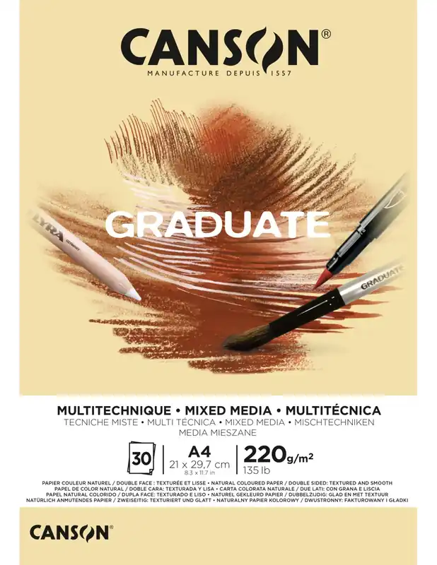 Bloc de Dibujo Canson Graduate A4 Mix Media está diseñado para soportar una variedad de técnicas artísticas, desde acuarela y gouache hasta lápiz y rotulador. Con papel de alta calidad de 200 g/m², ofrece una excelente absorción y durabilidad.