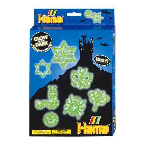 5 mm diámetro. El tamaño más popular y usado de Hama Beads. A partir de 5 años.Esta caja regalo contiene:* 1500 Hama Beads 'Glow in the dark' verde* 1 Placa cuadrada 7×7 cms* 1 Placa redonda 7 cms diámetro* 1 Placa estrella pequeña* 1 Hoja de papel de planchado Hama* 1 Hoja de diseños* 1 Hoja de instrucciones de planchado