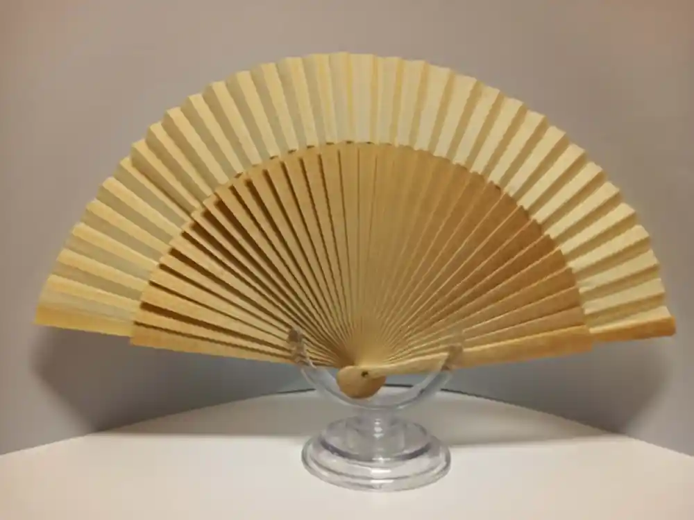 Abanico de madera de roble de 23 centímetros cerrado. Barnizado 2 caras (mate por detrás brillo por delante).Tela de color beige.Fabricado en España.