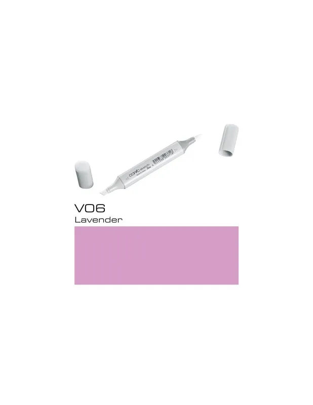 ROTULADOR COPIC SKETCH V06 LavenderCOPIC SKETCH V06 LavenderLos rotuladores copic sketch son los rotuladores preferidos de los profesionales del diseño, la ilustración, el dibujo manga y el scrap.Con sus 358 colores tienes todo un mundo de posibilidades a tu alcance, es la mayor gama de colores que existe en rotuladores, dificilmente no encontrarás aquella tonalidad que estás buscando.El rotulador copic sketch tiene dos puntas: una biselada para colorear grandes áreas y otra de pincel muy flexible ideal para dibujar. Las puntas se pueden cambiar cuando se gastan.Son rotuladores recargables, se puede volver a aprovechar la carcasa, con un frasco de tinta copic ink de 25 cc puedes rellenar hasta 12 veces un sketch.La tinta copic es a base de alcohol, es permanente y no es tóxica. Cuando se seca está libre de ácido.Los rotuladores copic sketch se pueden utilizar también con el sistema de aerografia copic.