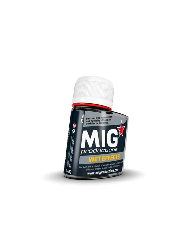 75ml Efectos Mojados Mig Productions P409Consigue verdaderos efectos de apariencia mojada y humedad en vehículos o dioramas.EFECTOS:Aplique el efecto con un pincel suave redondo de tamaño fino. Trabaje con el producto sobre su maqueta en las zonas deseadas consiguiendo un ligero brillo creando la apariencia de humedad y mojado. Deje secar durante unos 15 minutos y luego limpie el exceso, si es necesario, utilizando un pincel humedecido con Thinner for Washes. Tambien se puede utilizar en lineas verticales como efectos de lluvia.