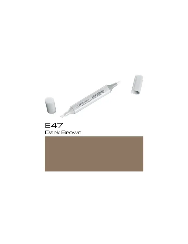 ROTULADOR COPIC SKETCH E47 Dark BrownCOPIC SKETCH E47 Dark BrownLos rotuladores copic sketch son los rotuladores preferidos de los profesionales del diseño, la ilustración, el dibujo manga y el scrap.Con sus 358 colores tienes todo un mundo de posibilidades a tu alcance, es la mayor gama de colores que existe en rotuladores, dificilmente no encontrarás aquella tonalidad que estás buscando.El rotulador copic sketch tiene dos puntas: una biselada para colorear grandes áreas y otra de pincel muy flexible ideal para dibujar. Las puntas se pueden cambiar cuando se gastan.Son rotuladores recargables, se puede volver a aprovechar la carcasa, con un frasco de tinta copic ink de 25 cc puedes rellenar hasta 12 veces un sketch.La tinta copic es a base de alcohol, es permanente y no es tóxica. Cuando se seca está libre de ácido.Los rotuladores copic sketch se pueden utilizar también con el sistema de aerografia copic.