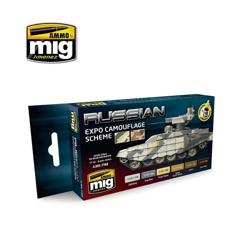 Este set se compone de la gama de colores creados por el equipo de diseño UVZ que se utilizó para la exposición Russian Arms Fair. Aunque estos no son colores oficiales del ejército ruso en el campo de batalla, muestran los mas modernas camuflajes incluyendo esquemas de camuflaje splinter que han sido vistos en T-14, T-15, y varios vehículos. Todas las pinturas son acrílicas con una formula optimizada para obtener el máximo rendimiento tanto con pincel como con aerógrafo que nos permitirá conseguir el color adecuado en nuestras maquetas. Cada bote incluye un agitador de acero inoxidable para facilitar una mezcla más rápida y homogénea. Presentación en botes de 17ml. Soluble en agua, sin olor y no tóxico. Recomendamos A.MIG-2000 AcrylicThinner para una correcta disolución. Secado completo en 24h.Incluye:A.MIG-130 Faded YellowA.MIG-041 Dark RustA.MIG-048 YellowA.MIG-061 Warm Sand YellowA.MIG-119 Cold GrayA.MIG-210 Gray Blue FS35237