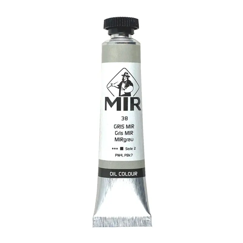Óleo de calidad extra-fina, constituido por pigmentos específicos para bellas artes, de alta estabilidad a la luz y luminosidad. Los aceites vegetales secantes que componen el óleo Mir son escogidos para que no modifiquen el tono del pigmento, sequen uniformemente en una capa incolora, de máxima transparencia y homogeneidad.Parte fundamental de la fabricación del óleo Mir es el refinado de la pasta inicial de pigmento y aceite. Esta masa se hace pasar a través de unos molinos compuestos por tres rodillos de acero, tantas veces como sea necesario, para conseguir la perfecta dispersión de las partículas de pigmento en el medio del aceite. De esta forma el óleo obtendrá sus características de finura, cremosidad, brillo y poder tintóreo y se favorece la estabilidad en el tiempo de la pintura tanto dentro del tubo como una vez aplicada.Cada pigmento tiene un tiempo de secado natural, diferente según las condiciones de temperatura y humedad. En la fabricación del óleo Mir intentamos acercar los diferentes tiempos de secado a fin de que los colores de una obra sequen de forma pareja pero no queremos con ello comprometer la estabilidad de la pintura por lo que siempre habrán diferencias que el artista asume como consustanciales a la técnica del óleo.La gama de óleo Mir contiene básicamente colores cubrientes complementada con semi y totalmente transparentes. La cubrición es una propiedad intrínseca del pigmento en el medio aceite y el artista sabe hacer uso tanto de los pigmentos que tapan como de aquellos transparentes que le permiten sutiles efectos de veladuras.