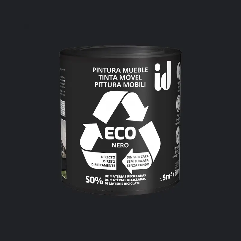 La pintura Eco Muebles de INITIATIVES DECORATION en color negro es la solución perfecta para transformar y proteger tus muebles con un acabado elegante y atemporal. Su tono neutro y versátil aporta luminosidad y sofisticación a cualquier espacio, permitiéndote renovar tus muebles con un estilo moderno y armonioso. ¡Dale una nueva vida a tus muebles con facilidad y sin preocupaciones!Su fórmula ecológica, sin disolventes agresivos y con bajo contenido en compuestos orgánicos volátiles (COV), garantiza un entorno más saludable sin comprometer la calidad ni la durabilidad. Gracias a su composición respetuosa con el medio ambiente, podrás pintar con total tranquilidad en espacios interiores, sin olores fuertes ni emisiones contaminantes. La resina de su composición proviene del reciclaje de parabrisas.Se adhiere fácilmente a múltiples superficies como madera, melamina, MDF y otras, sin necesidad de imprimación en la mayoría de los casos. Su excelente capacidad de cubrimiento reduce el número de capas necesarias, asegurando un resultado uniforme y de gran resistencia. Además, su acabado liso y sedoso realza la belleza natural de los muebles, dándoles un toque renovado y sofisticado.Aplicación sencilla y eficiente.Gracias a su textura fluida y cremosa, la pintura Eco Muebles de INITIATIVES DECORATION permite una aplicación sin esfuerzo, ya sea con brocha o rodillo. Su secado rápido facilita el proceso de renovación, permitiéndote disfrutar del resultado en menos tiempo.Modo de uso1. Preparación: Mezclar bien la pintura antes de su uso para garantizar una distribución homogénea de los pigmentos.2. Aplicación:- Aplicar la pintura con un rodillo en capas finas y uniformes. Para evitar marcas de empalmes, pintar en áreas pequeñas de 1 a 2 m² a la vez.- Cruzar las capas aplicando primero de arriba hacia abajo y luego de izquierda a derecha. Finalizar alisando suavemente de arriba a abajo para un acabado impecable.- Sobre maderas con tanino o resinosas, utilizar antes la Primaria anti tanino. Sobre melamina y soportes difíciles, hacer una prueba antes y si es necesario aplicar una capa de Primaria soportes especiales.3. Secado: Dejar secar al menos 4 horas antes de aplicar una segunda capa si es necesario.Pintura indicada para restaurar, renovar o personalizar muebles en interiores, esta pintura ofrece un acabado duradero, resistente a roces y fácil de limpiar. Transforma tus muebles con un toque de estilo y sostenibilidad, disfrutando de un hogar más acogedor y armonioso.En nuestra tienda física de pintura decorativa en Madrid, disponemos de una tablillas de madera con pintura Eco Muebles para apreciar mejor los colores y que veas su alta calidad antes de adquirirla.Puedes ver algún detalle adicional haciendo clic en este vínculo.
