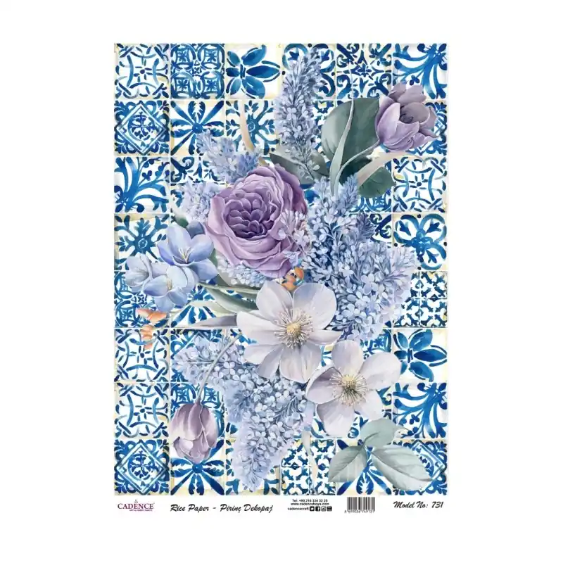 Papel de Arroz para decoupage, mix media y manualidades de la prestigiosa marca CADENCE.Esta colección de papeles de arroz se caracteriza por la calidad de sus diseños y sus elaborados dibujos.Puedes usar el pliego entero o por trozos.Pliego de 30x41cmCollage de diversas flores sobre fondos cerámicos, textiles o mix media.