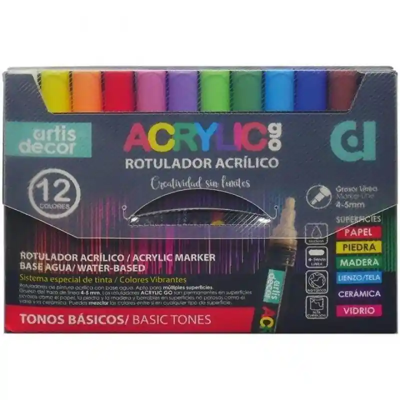 SET 12 ROTULADORES ACRYLIC GO (4-5 mm) TONOS BÁSICOS ARTIS DECORRotuladores acrílicos, punta de 4-5 mm. Estuche de plástico con 12 colores en tonos básicos.Roruladores de pintura acrílica, base agua. Apto para multiples superficies. Grueso del trazo de línea 4-5 mm.Los rotuladores ACRYLIC GO son permanentes en superficies porosas como el papel, la piedra y la madera y borrables en superficies no porosas como el vidrio y la cerámica.Colores mezclables entre sí en cualquier superficie.