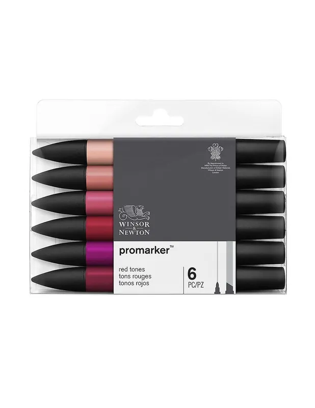 Caja con 6 rotuladores Promarker en diferentes tonalidades de rojo, perfectos para crear efectos dramáticos y detalles vibrantes en tus ilustraciones.