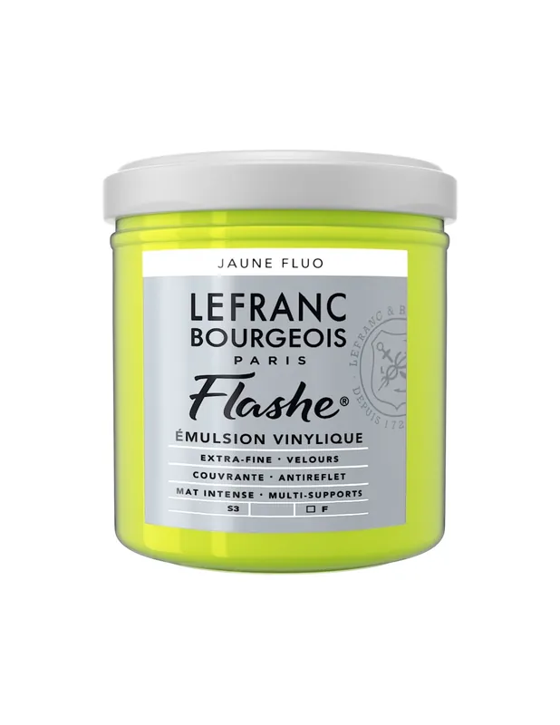 Pintura muy mate , aterciopelada y opaca. Se diluye con agua y se vuelve indeleble una vez seco. Se puede aplicar con pincel, brocha o esponja. Es un producto muy polivalente que ofrece múltiples utilidades como la pintura en tela, decoración interior, preparación de fondos para óleo o acrílico etc. Formato 125 ml presentado en bote de cristal LEFRANC BOURGEOIS ACRILICO FLASHE 125ML Amarillo claro fluorescente