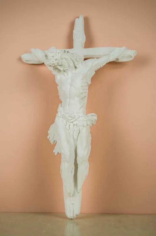 Cristo moderno, sin manos ni pies.Figura de escayola para decorar.Se recomienda usar previamente tapaporos, para preparar mejor la supeficie para la pintura, logrando además que absorba menor cantidad de la misma, y pudiendo también finalmente usarlo como barniz protector de la pieza terminada.