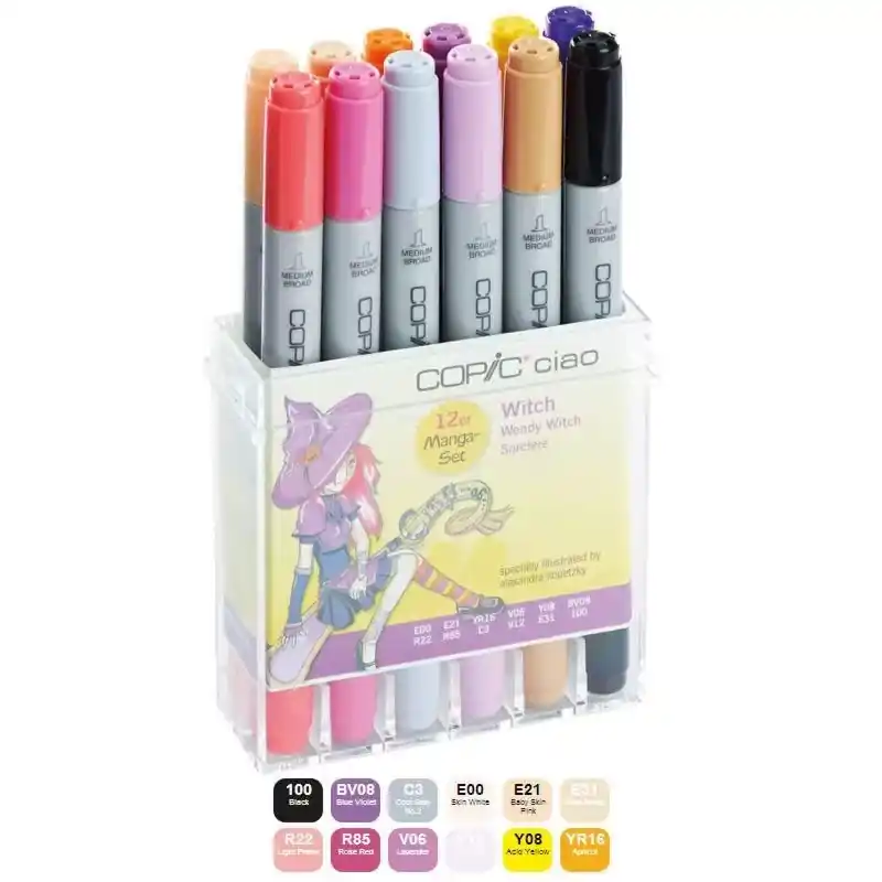Los Copic Ciao es la línea de rotuladores más económica de Copic.Son perfectos para iniciación.Gama de rotuladores de alta calidad, para ilustración, manga y dibujo profesional.Perfectos para colorear imágenes y estampaciones de sellos.Se pueden usar sobre papel, tela, madera, plástico y otras superficies.Disponen de dos puntas, biselada y punta pincel para esbozos rápidos.Los colores se pueden mezclar para crear sombras y degradados de color.Características:Tinta al alcohol.Rotulador permanente.Secado rápido.No tóxico, libre de ácido.Vida aproximada de 3 años.1,4 ml cada uno.Presentando en una cómoda caja protectora transparente, permite ver la disposición de todos los colores y los protege del polvo y la suciedad.Set temático especialmente diseñado por la ilustradora mangaAlexandra Kopetzsky.Rotuladores Black, Blue Violet, Cool Gray N 3, Skin White, Baby Skin Pinck, Brick Beige, Light Prawn, Rose Red, Lavender, Pale Lilac, Acid Yellow y Apricot. Los colores usados en la portada de este set están incluídos en el mismo.¿Cómo reconozco los colores?La numeración es acorde al tipo de color, saturación y brillo.Por una parte las letras representan loscoloresque son:BV (Blue Violet), V (Violet), RV (Red Violet), R (Red), YR (Yellow Red), Y (Yellow), YG (Yellow Green), G (Green), GB (Green Blue), B (Blue) y E (Earth). y losgrisesC (Cold), T (Toner), N (Neutral) y W (Warm) y losfluorescentesF (Fluorescent) y por últimoExtra 100(Black),110(Special Black) yBlender.Además de la letra también incluye cifras, el primer dígito te indica la saturación y el segundo, el brillo. En lasaturaciónel 0 es el color mas puro e intenso y el 9 el tono más gris. El segundo dígito que es elbrillorepresentado por la escala de 0 el más pálido y 9 el color más oscuro.