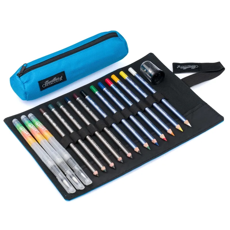 Estuche enrollable con estuche interior adicional, de la prestigiosa marca de Bellas Artes austríaca CretacolorContenido:- 12 lápices acuarelables- 1 Sacapuntas con depósito- 3 pinceles de agua (fino, medio, grueso)- 1 estuche