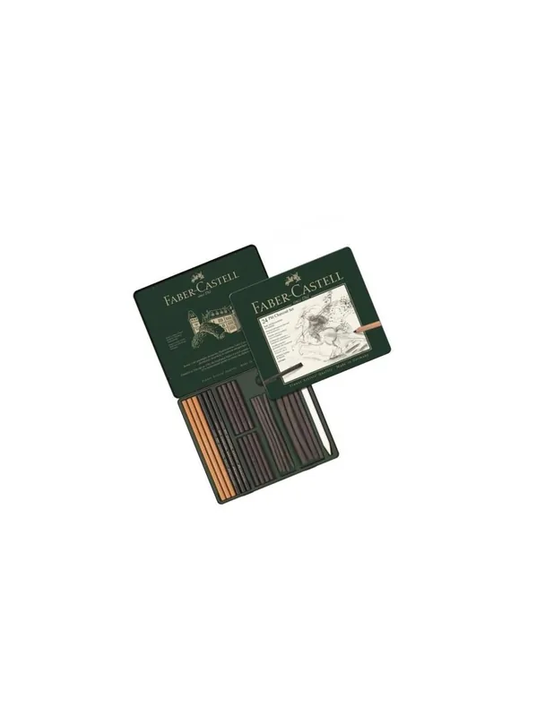 Fantástico estuche de metal que incluye un surtido de carboncillos, tizas de carbón naturales y lápices de diferentes grados de dureza. También incluye una goma moldeable y un difumino.