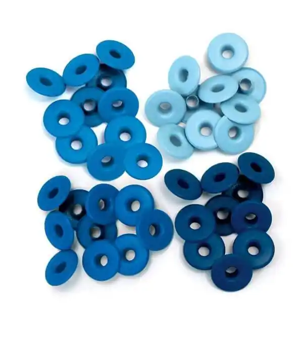 Incluye 40 eyelets en 4 tonos azul diferentes (8 de cada).Medida: 1,27 cm.Marca: We R Memory Keepers.