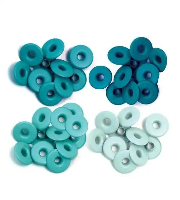 Incluye 40 eyelets en 4 tonos turquesa diferentes (8 de cada).Medida: 1,27 cm.Marca: We R Memory Keepers.