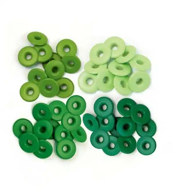 Incluye 40 eyelets en 4 tonos verde diferentes (8 de cada).Medida: 1,27 cm.Marca: We R Memory Keepers.
