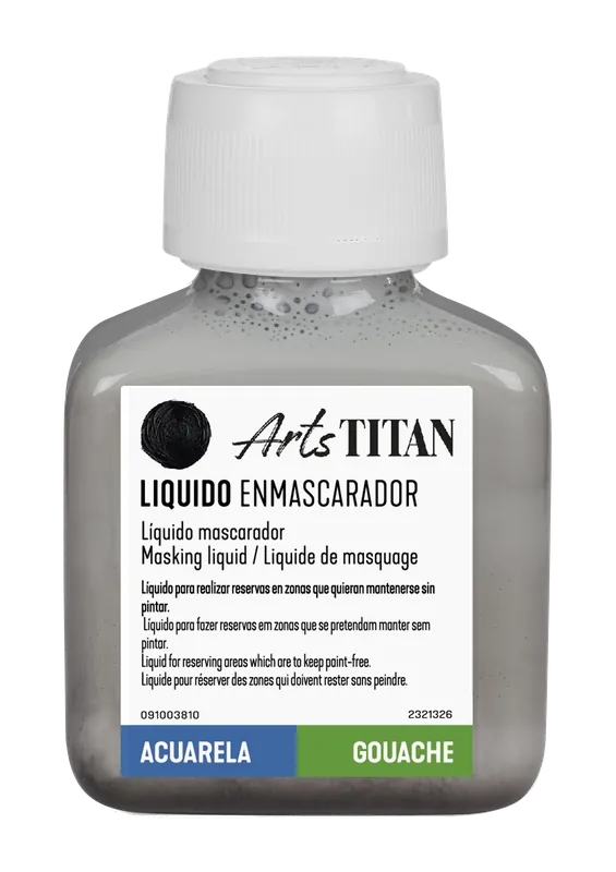 TITÁN LIQUIDO ENMASCARADORLíquido para reservar zonas del papel que quieran mantenerse sin pintar al aplicar las acuarelas, gouache, temperas u otras pinturas al agua, diluidas ampliamente.Una vez seco, no dejar el producto sobre la obra durante períodos largos.Se retira pelando o frotando con el dedo o con una goma de borrar. Los pinceles y utensilios deben lavarse inmediatamente con agua y jabón.Características:Aplicación: Espátula, pincel , tiralíneas o plumillaNaturaleza: Látex de cauchoAcabado: Satinado brillanteSecado: 15-30 min. a 23ºCDiluyentes: Agua
