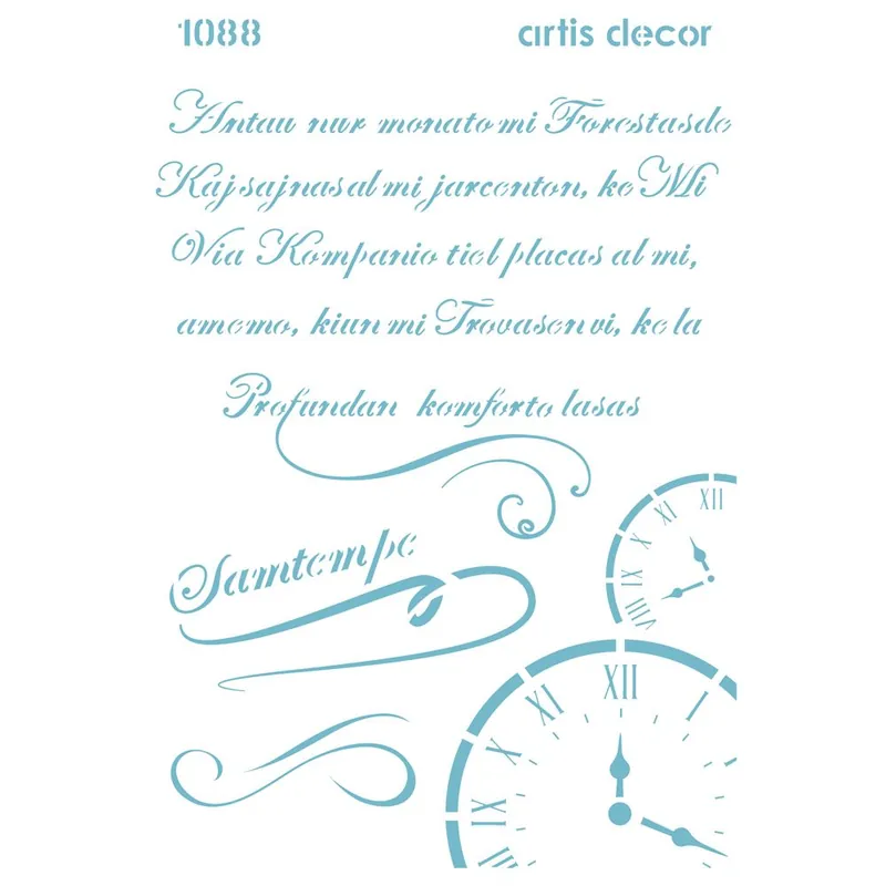 Plantilla stencil 20×28,5cm con diseño de texto manuscrito y relojes.Las Plantillas de Stencil Artis Decor están realizadas en lámina de acetato flexible de 190 micras, lo que le da una consistencia perfecta para trabajar.Se pueden utilizar en el ámbito de las manualidades, el mixed media y las bellas artes.