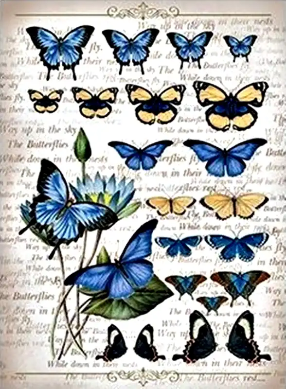 Papel de Arroz para decoupage, mix media y manualidades de la prestigiosa marca CADENCE.Esta colección de papeles de arroz se caracteriza por la calidad de sus diseños y sus elaborados dibujos.Puedes usar el pliego entero o por trozos.Pliego de 30x41cmMariposas azules sobre fondo de manuscrito