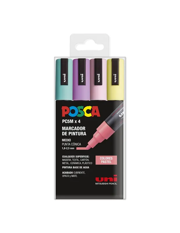 Set de 4 Rotuladores Posca PC5M Pastel incluye cuatro tonos suaves con punta de 1.8 mm, ideales para trazos medianos y cobertura uniforme. La tinta opaca a base de agua es resistente al agua y a la decoloración, ofreciendo acabados delicados y duraderos en diversas superficies. Perfecto para proyectos artísticos y manualidades que requieren colores pastel sutiles y elegantes.