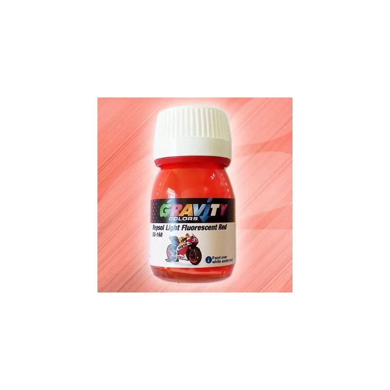 Repsol Light Fluorescent Red Gravity Colors Paint – GC-168Fluorescent light red color coded as RAL 3026. Due to its low opacity This paint needs to be painted over a WHITE UNDERCOAT! (Not primer)Color matched airbrush ready lacquer paint.Net volume: 1 fl.oz/30ml