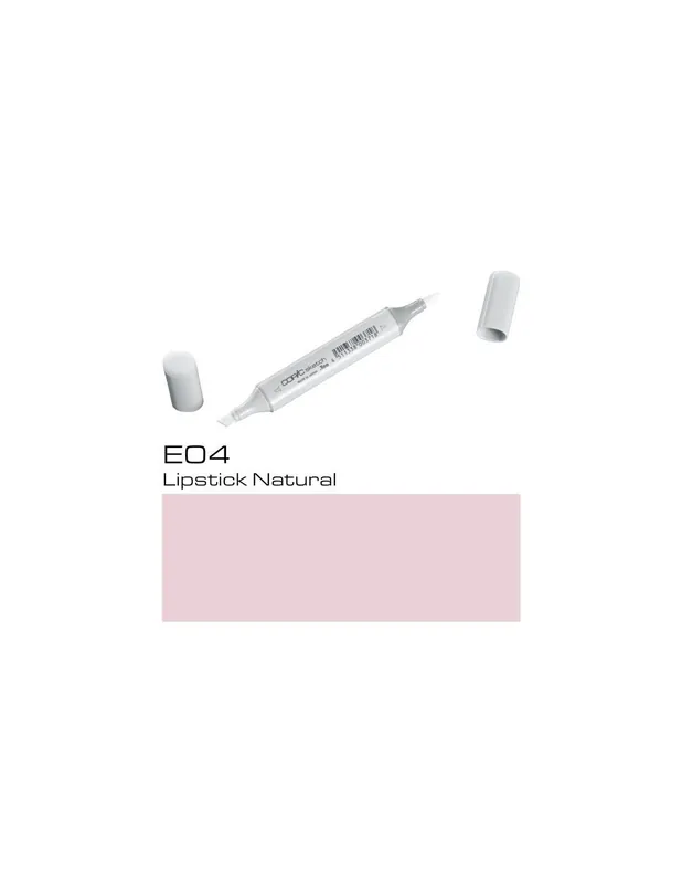 ROTULADOR COPIC SKETCH E04 Lipstick NaturalCOPIC SKETCH E04 Lipstick NaturalLos rotuladores copic sketch son los rotuladores preferidos de los profesionales del diseño, la ilustración, el dibujo manga y el scrap.Con sus 358 colores tienes todo un mundo de posibilidades a tu alcance, es la mayor gama de colores que existe en rotuladores, dificilmente no encontrarás aquella tonalidad que estás buscando.El rotulador copic sketch tiene dos puntas: una biselada para colorear grandes áreas y otra de pincel muy flexible ideal para dibujar. Las puntas se pueden cambiar cuando se gastan.Son rotuladores recargables, se puede volver a aprovechar la carcasa, con un frasco de tinta copic ink de 25 cc puedes rellenar hasta 12 veces un sketch.La tinta copic es a base de alcohol, es permanente y no es tóxica. Cuando se seca está libre de ácido.Los rotuladores copic sketch se pueden utilizar también con el sistema de aerografia copic.