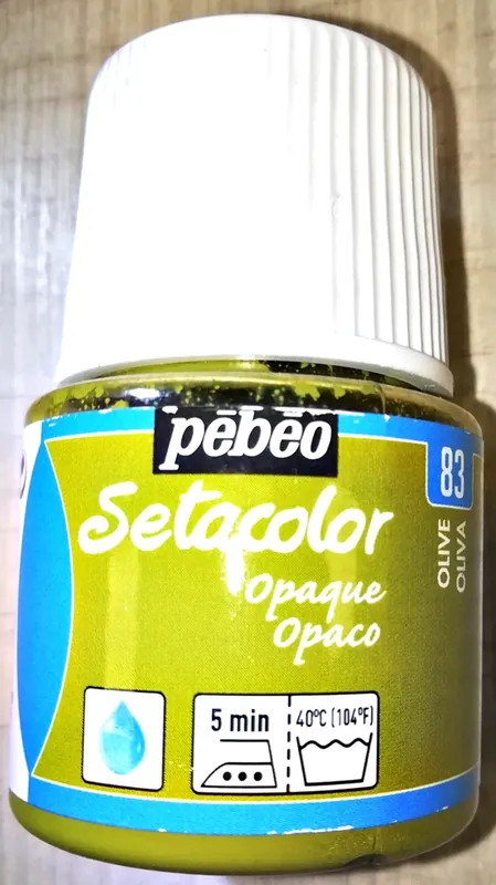 Pintura para tela Setacolor opaco efecto mate de 45ml de Pebeo.Setacolor opaco es una pintura de base agua destinada a la decoración de telas oscuras, tanto finas como gruesas. De altísima calidad sus colores son vivos, intensos y duraderos, además de altamente resistentes a la luz.Sus propiedades los hacen mezclables entre sí y no es necesario diluirlos en agua, vienen listos para usarse.Aptos para la mayoría de tejidos, de fibra o sintéticos, su acabado es mate, opaco y muy duradero.Una vez aplicada la pintura se ha de dejar secar 1 hora al aire libre.Para fijar la pintura a la tela puedes hacerlo de dos maneras, con la plancha durante 5 minutos, en posición algodón, sin vapor, sobre el reverso del tejido o bien en el horno doméstico, durante 5 minutos a 150ºC.Utilizado en conjunto con los auxiliares Setacolor se pueden obtener diversos efectos para multiplicar las técnicas.Disponible: 23 colores de pintura para tela Setacolor Opaco 45ml.Limpieza Herramientas: Agua y jabón.