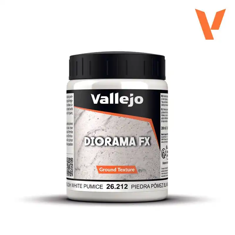 Piedra Pómez BlancaSituar una maqueta en un diorama, una viñeta, supone conceder a nuestro modelo o figura un escenario, una realidad y un entorno físico que dará una dimensión de ubicación, una razón a la humedad o al barro, la arena reseca de un desierto o la tierra oscura de las zonas boscosas del centro de Europa. La gama de Diorama FX facilita al modelista los medios para reproducir terrenos, efectos de nieve, barro y agua que aportaran mayor realismo a su maqueta.Seguridad: Diorama FX no es inflamable y no contiene disolventes. Vea información relativa a las certificaciones de producto en el apartado de Seguridad.Presentación: Disponible en tarros de 200 ml/6.76 fl oz.Recomendaciones de uso: Piedra Pómez Blanca es una pasta espesa de resina, blanco de titanio y piedra pómez natural, con un acabado áspero blanco. Apto para crear superficies y terrenos irregulares, relieves y picos.