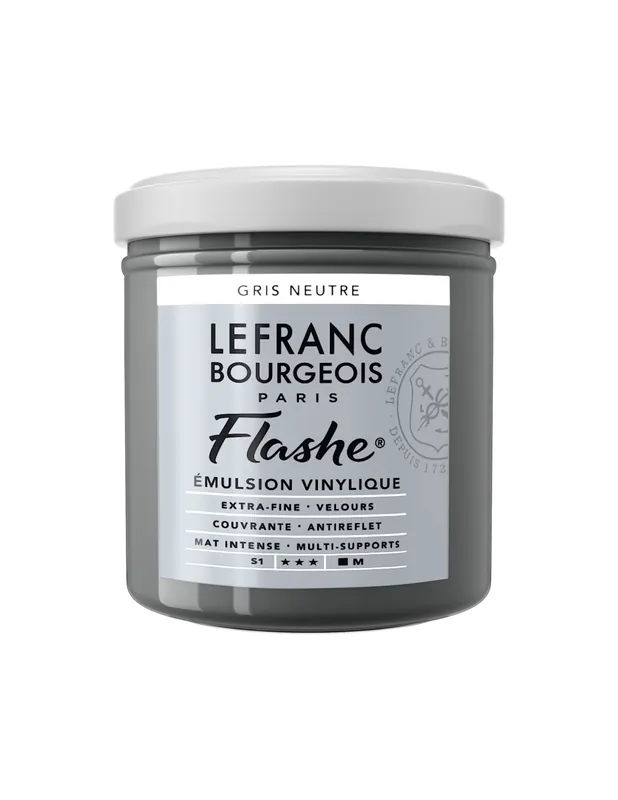 Pintura muy mate , aterciopelada y opaca. Se diluye con agua y se vuelve indeleble una vez seco. Se puede aplicar con pincel, brocha o esponja. Es un producto muy polivalente que ofrece múltiples utilidades como la pintura en tela, decoración interior, preparación de fondos para óleo o acrílico etc. Formato 125 ml presentado en bote de cristal LEFRANC BOURGEOIS ACRILICO FLASHE 125ML Gris neutro