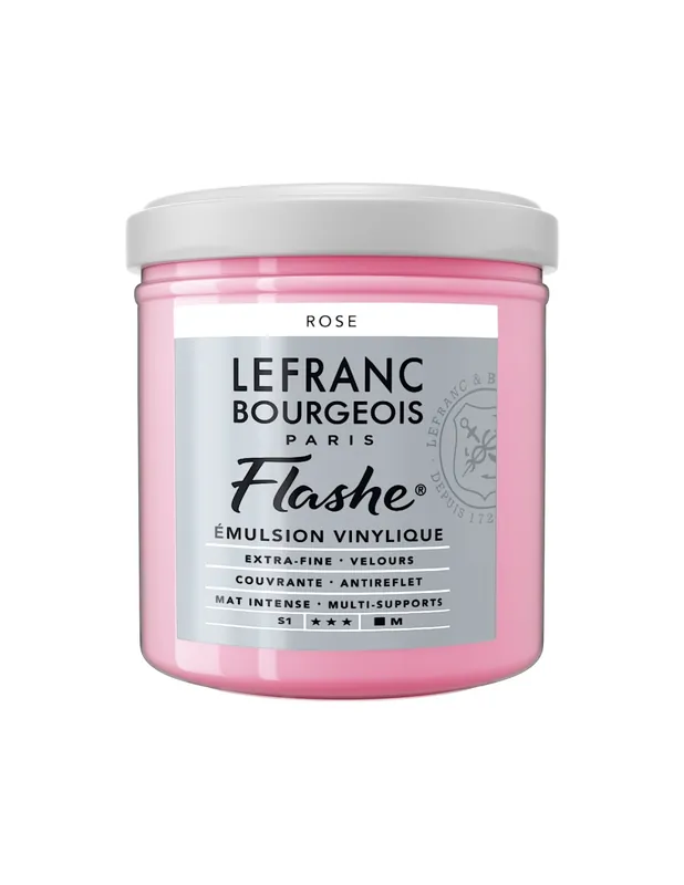 Pintura muy mate , aterciopelada y opaca. Se diluye con agua y se vuelve indeleble una vez seco. Se puede aplicar con pincel, brocha o esponja. Es un producto muy polivalente que ofrece múltiples utilidades como la pintura en tela, decoración interior, preparación de fondos para óleo o acrílico etc. Formato 125 ml presentado en bote de cristal LEFRANC BOURGEOIS ACRILICO FLASHE 125ML Rosa pálido