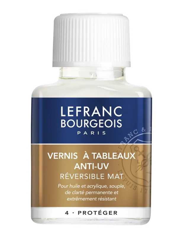 Barniz ideal para aplicar en pintura al óleo y el acrílico, sin reflejo, transparente y de una regularidad perfecta. Con resistencia a los Rayos UV LEFRANC BOURGEOIS ADITIVO OLEO 75ML BARNIZ ACRILICO MATE ANTI UV