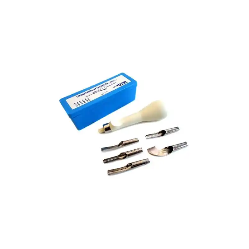 Estuche Mango con 5 gubias REIGCaja con un mango y 5 plumillas para hacer grabado con linóleo, madera blanda y planchas de goma.