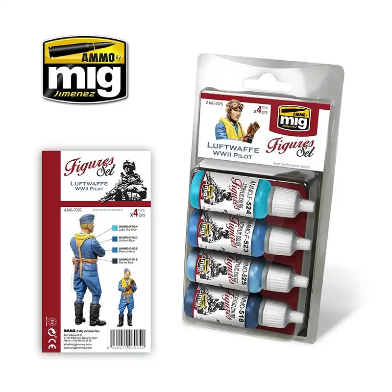 Pinturas acrílicas de alta calidad diseñadas para hacer sencilla la pintura de nuestras miniaturas.    Este pack incluye 4 colores necesarios para pintar el uniforme de vuelo de los pilotos de la Luftwaffe durante la Segunda Guerra Mundial. Los colores están seleccionados tras una rigurosa investigación uniformológica para poder decorar las miniaturas, resaltar el volumen y definir los detalles.Incluye los colores:AMMO.F-518 Marine BlueAMMO.F-523 Uniform BlueAMMO.F-524 Light Sky BlueAMMO.F-525 Medium Blue