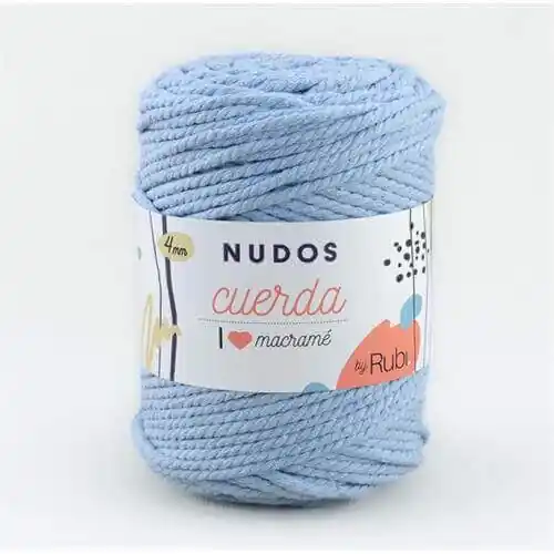 RUBI Nudos Cuerda 4 mm. 500 gr.Cuerda torcida de algodón reciclado y poliéster.¿Quieres saber más sobre Nudos Cuerda?Esta cuerda torcida de tres cabos te permitirá hacer tapices y diseños de macramé clásicos.Es un material con buena consistencia, torsión regular y que permite mantener su estado original a pesar de tener que hacer y deshacer tus labores en tu proceso creativo. Pero lo más importante es su suavidad, un regalo para tus manos.Cuenta con 12 colores, entre los que destacan tonos muy primaverales y de tendencia.¿Cómo cuidar tu labor? No se puede lavar, ni planchar.Composición: 80% Algodón reciclado 20% PoliésterPeso/longitud: 500 g., 90 m.