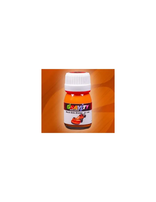 GC-1486. March Beta Orange Gravity Colors Paint.DIRECTIONS:Shake bottle until paint is thoroughly mixed!Use only with airbrush!Apply over Light Surface Primer even if Dark Surface Primer is the optimal for another color used to paint the same part.Paint in thin layers until color density achieved. Paint is not supposed to fix or remove imperfections on your scale model plastic surface. In other words, never spray wet coats.We recommend using low air pressure, between 15 to 20 PSI (1,0 to 1,4 BAR) when spraying Gravity Colors paints. This is just a recommendation. Optimal pressure is unique for each user, and depends on nozzle diameter, spraying distance or velocity, among other factors.Clear coating required.Do not use near heat, sparks or open flame!Use in well ventilated area.Tighten cap securely after each use.